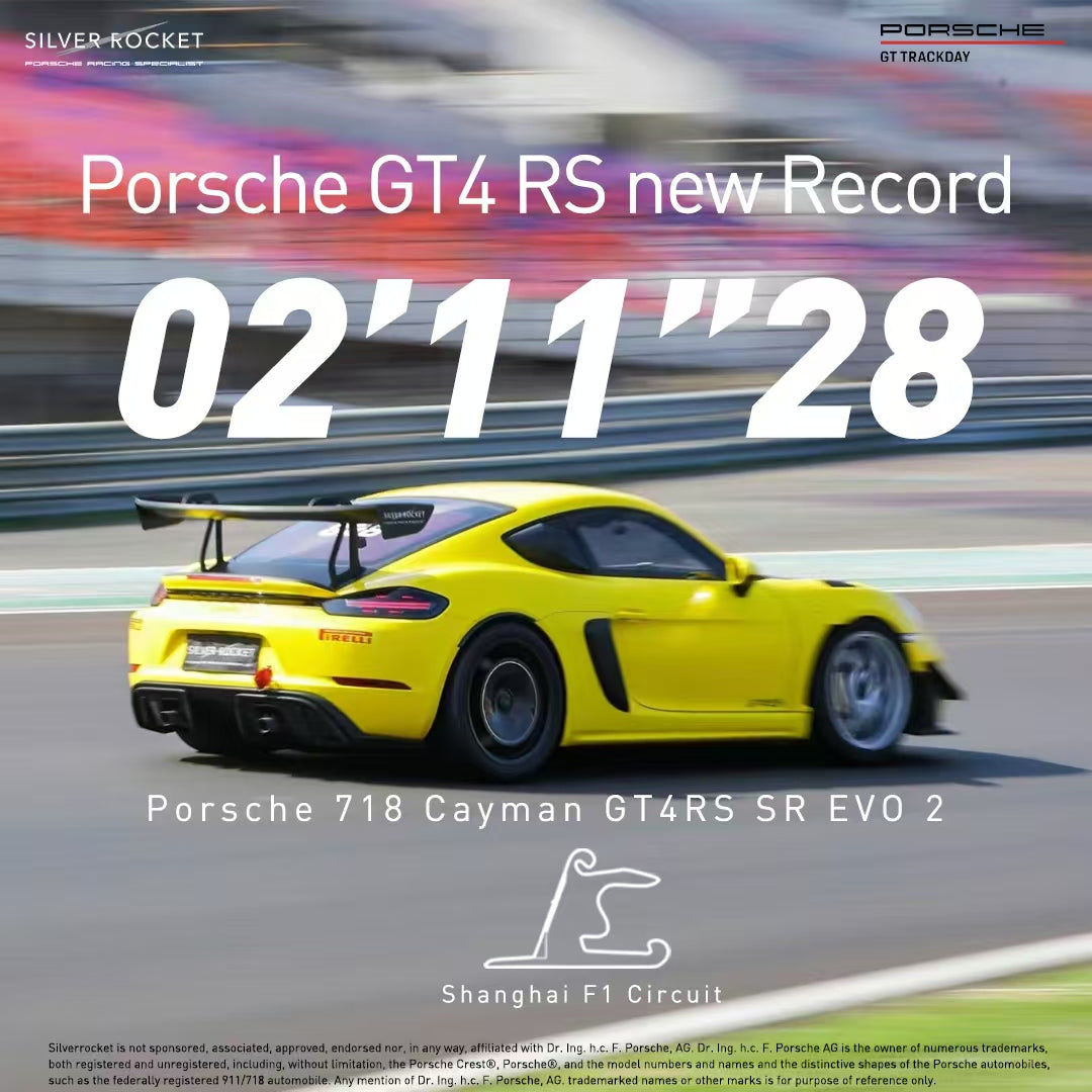 With the full set of SilverRocket 718 GT4 RS Performance kit, on October 23,2024, SilverRocket's GT4 RS SR EVO 2 set a new lap record - 2.11.28 for street-legal GT4 RS cars at the Porsche Official GT Track Day at Shanghai International Circuit.