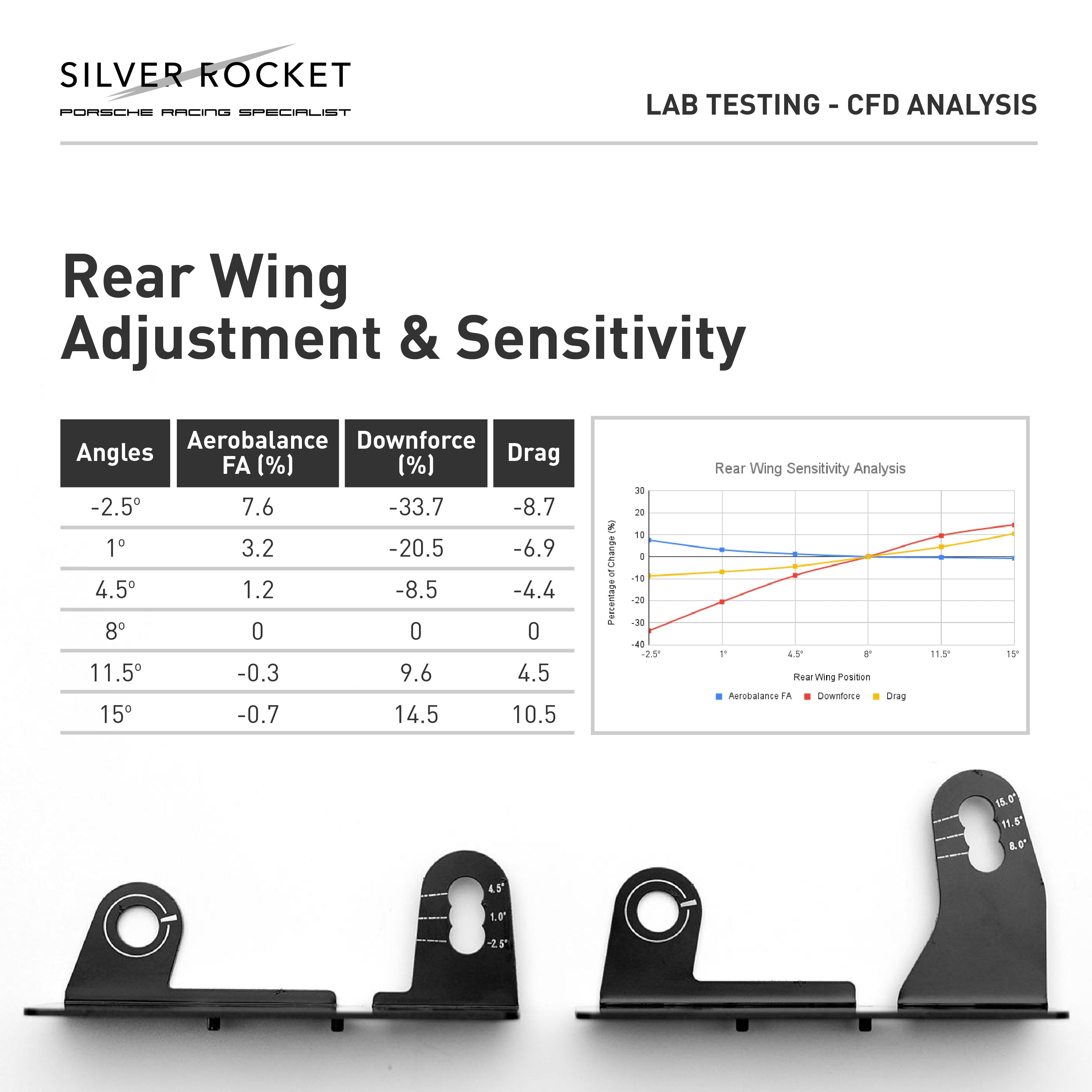 The SilverRocket DRS-1 Flex-Carbon Swan Neck Wing went through comprehensive CFD analysis with exceptional modeling conducted by expert engineer. Our real aero data shows that at 125mph and 15° AOA, the SilverRocket Clubsport rear wing provides a whooping 472 lbs of downforce, which is 170 lbs more than the stock GT4 RS rear wing.