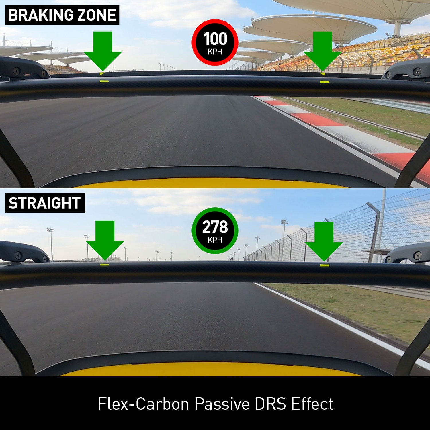 Our tests on the Shanghai F1 track demonstrates that the DRS-1 wing can passively drop back by ~1.5 degree of AOA at speeds between 150 to 270 km/h, resulting in an 8km/h increase in top speed compared to traditional wings. For the GT4 RS, this improvements translates to a lap time reduction of 0.5 seconds