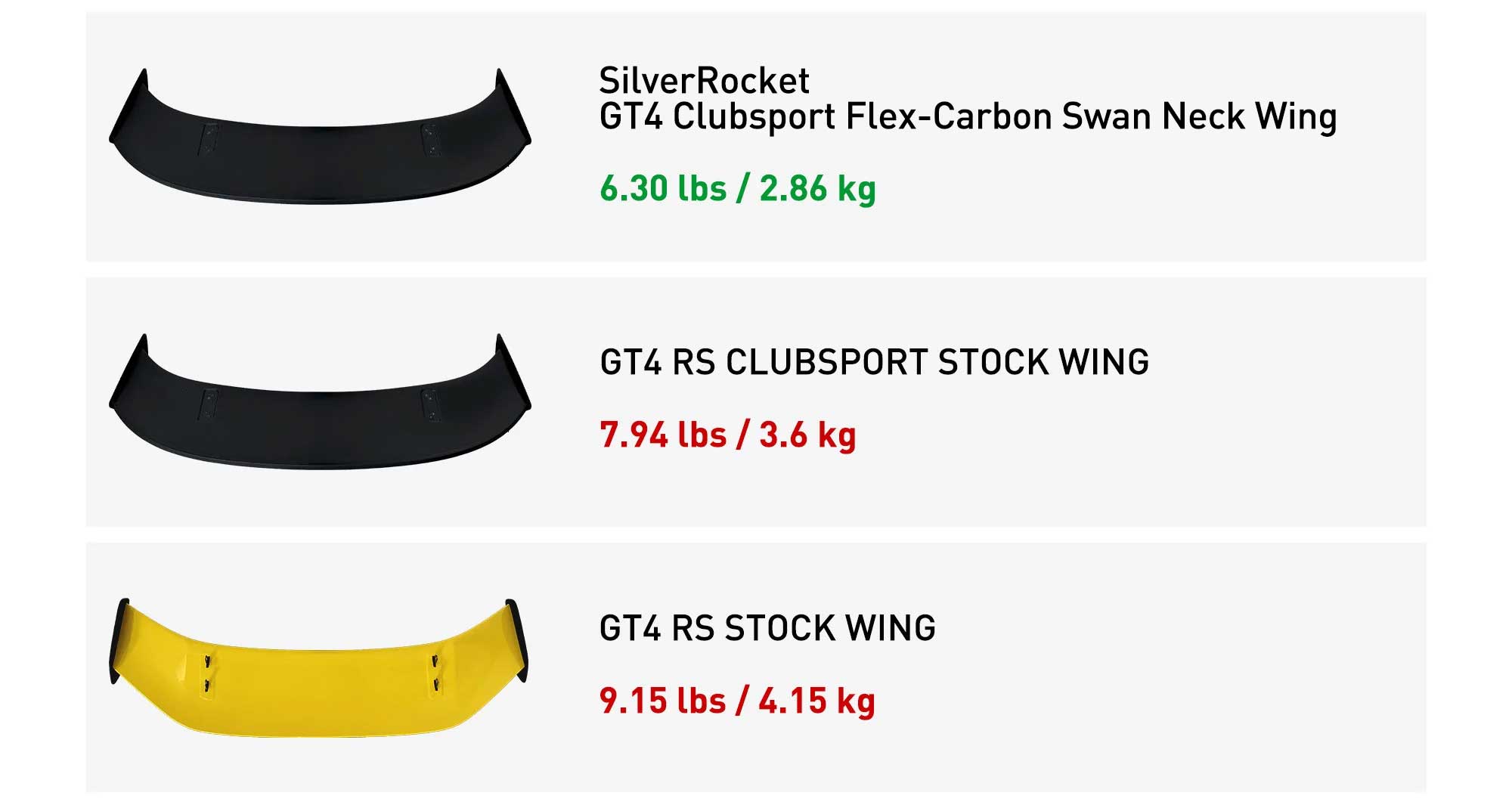 • Lightest Swan Neck Rear Wing For GT4 RS: Weighs at only 6.30 lbs, the SR GT4 Clubsport Flex-Carbon Swan Neck Wing is 2.85 lbs lighter than the stock GT4 RS wing and 1.64 lbs lighter than the stock GT4 RS Clubsport wing.