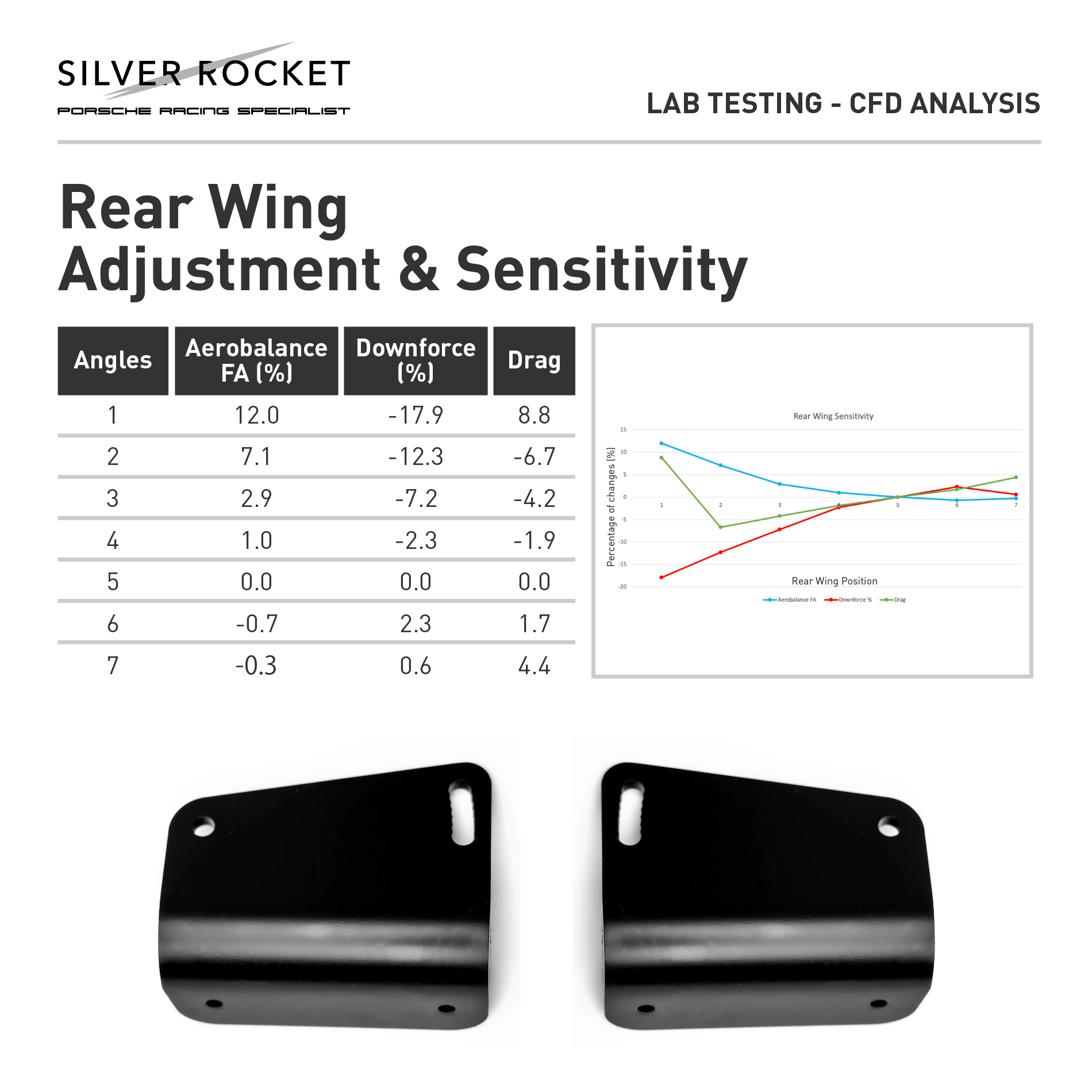 The SilverRocket 718 GT4 Swan Neck Wing offers 7 different angle of attack settings from -4° up to 8° in 2° steps as the stock clubsport bracket to provide great maneuverability for various driving preferences and track condition.