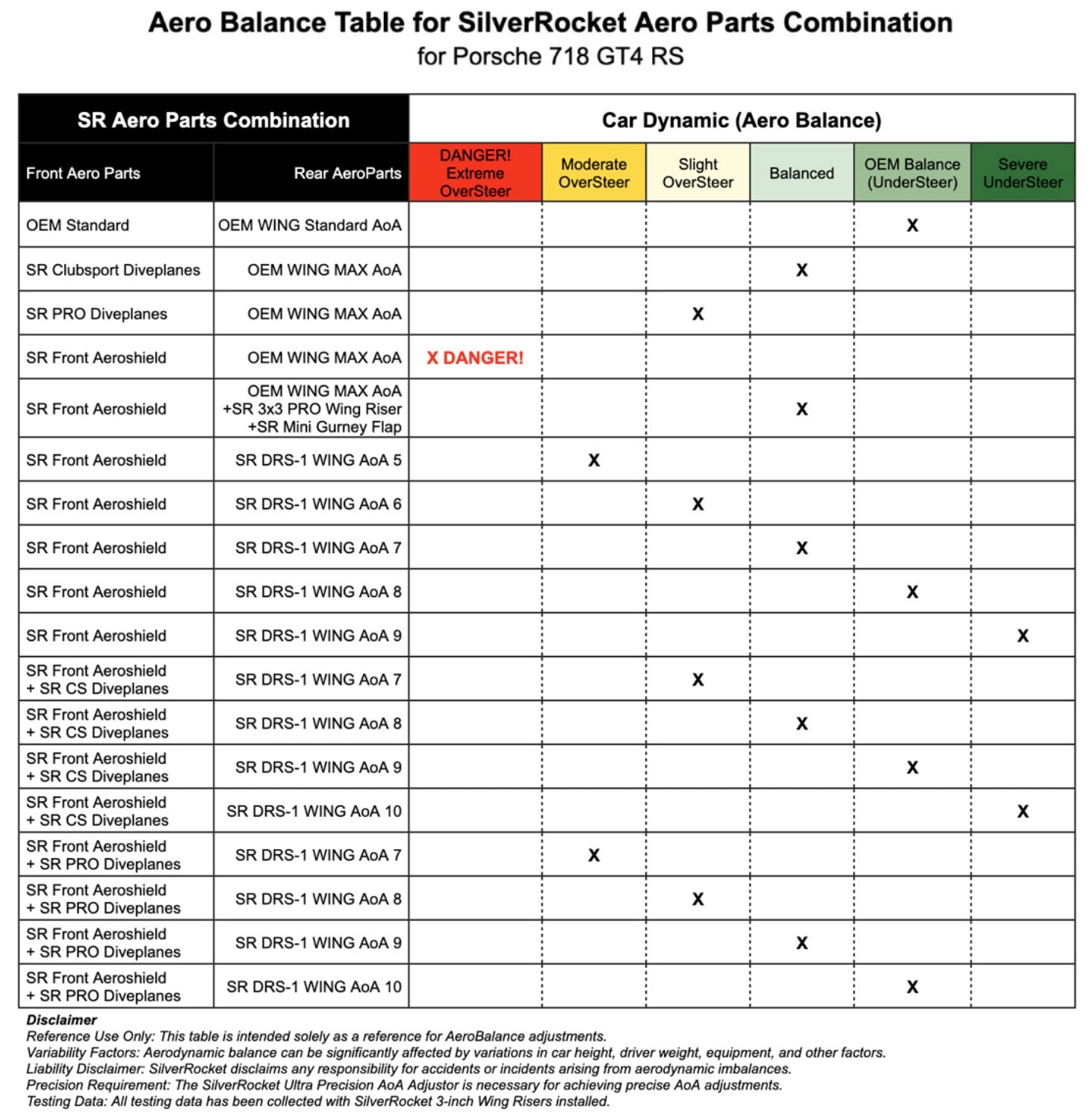 To ensure SR customers achieve the most optimal results from our Aero Pack, we conducted intensive track testing with professional drivers to identify the ideal aerodynamic balance setup. Below is the recommended Aero Balance Table, summarized from all track testing data.